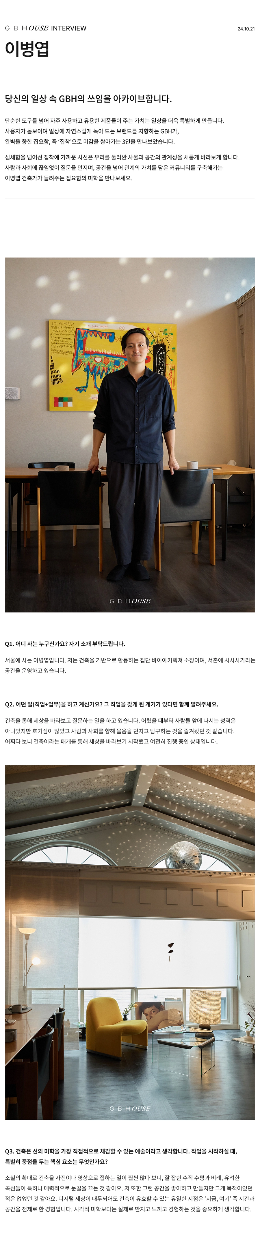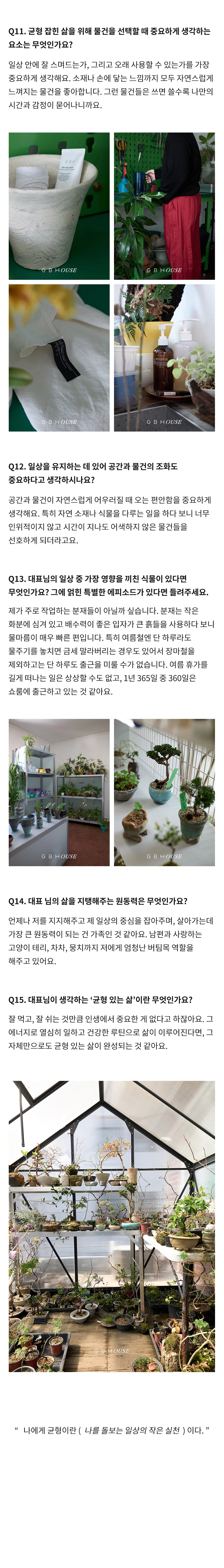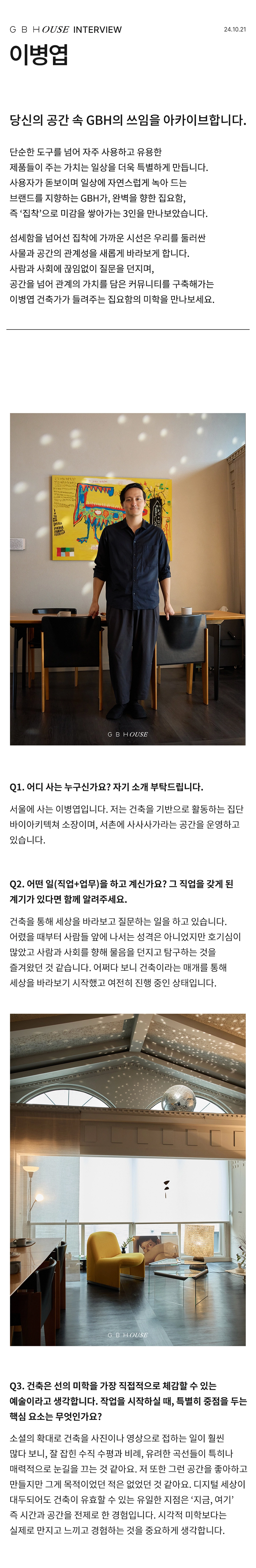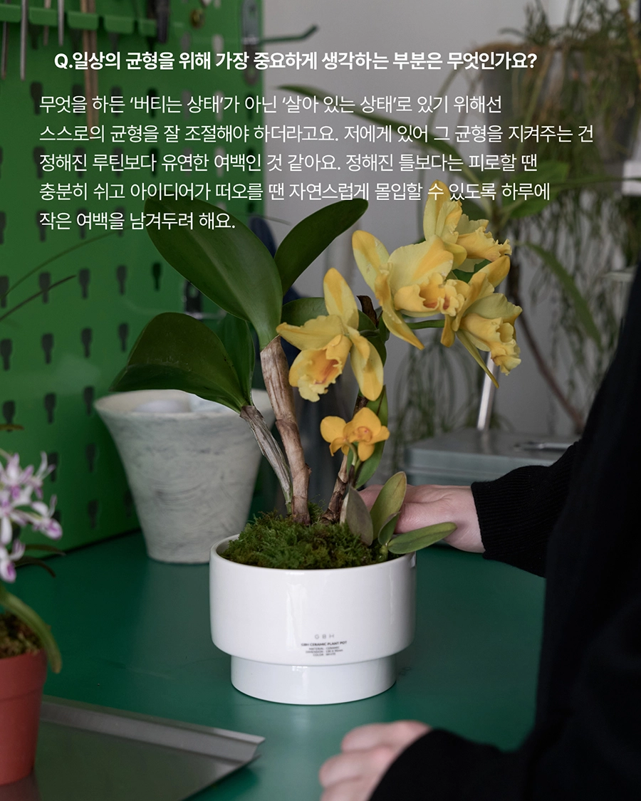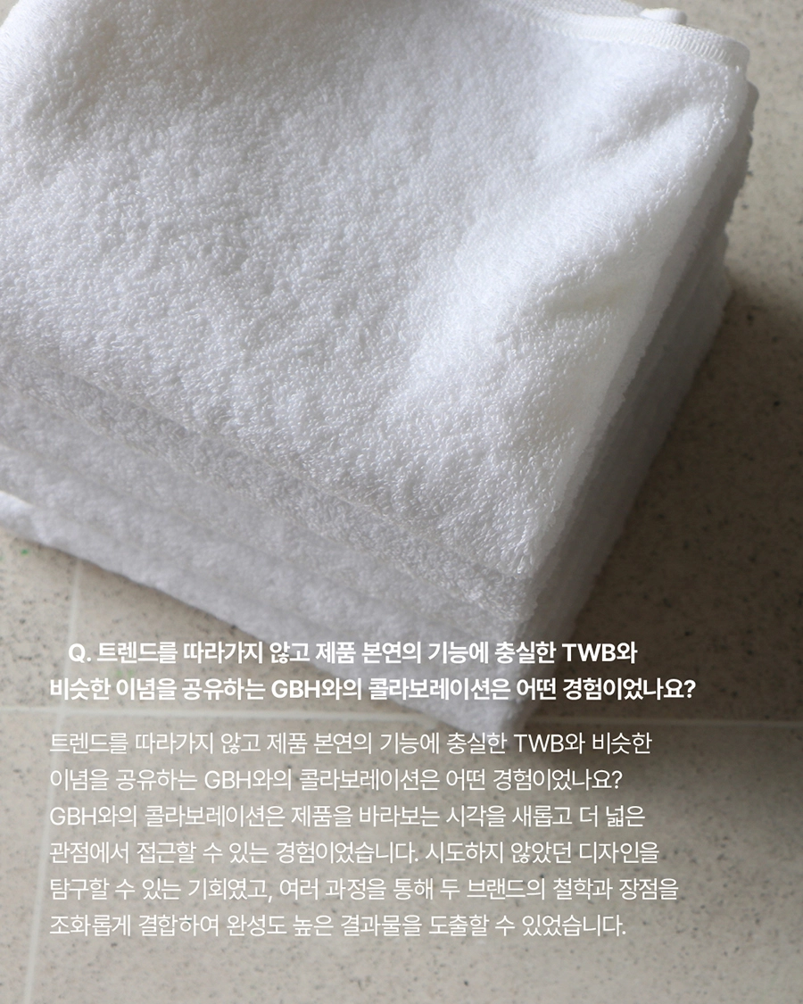 GBH()USE는 자사 제품이 일상 속에서 어떻게 활용되는지를 보여주는 콘텐츠 시리즈로, 다양한 인터뷰와 협업을 통해 브랜드의 철학과 제품을 자연스럽게 담아냅니다. 디자이너, 인플루언서 등 다양한 직군의 유저들과 함께 콘텐츠를 기획하고, 그들의 공간에서 제품이 사용되는 모습을 중심으로 구성되었습니다. 기획 의도에 맞춰 전반적인 편집 업무를 담당하여 효과적인 메시지 전달을 도왔습니다.