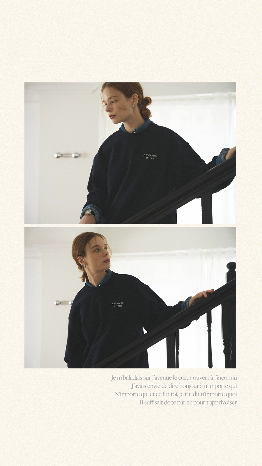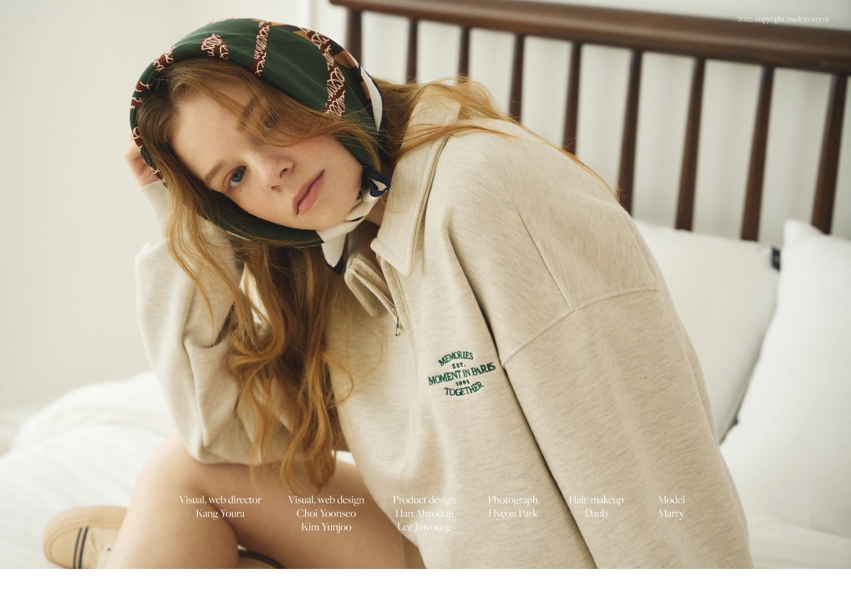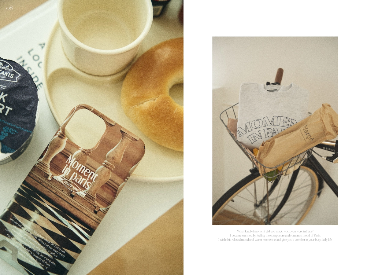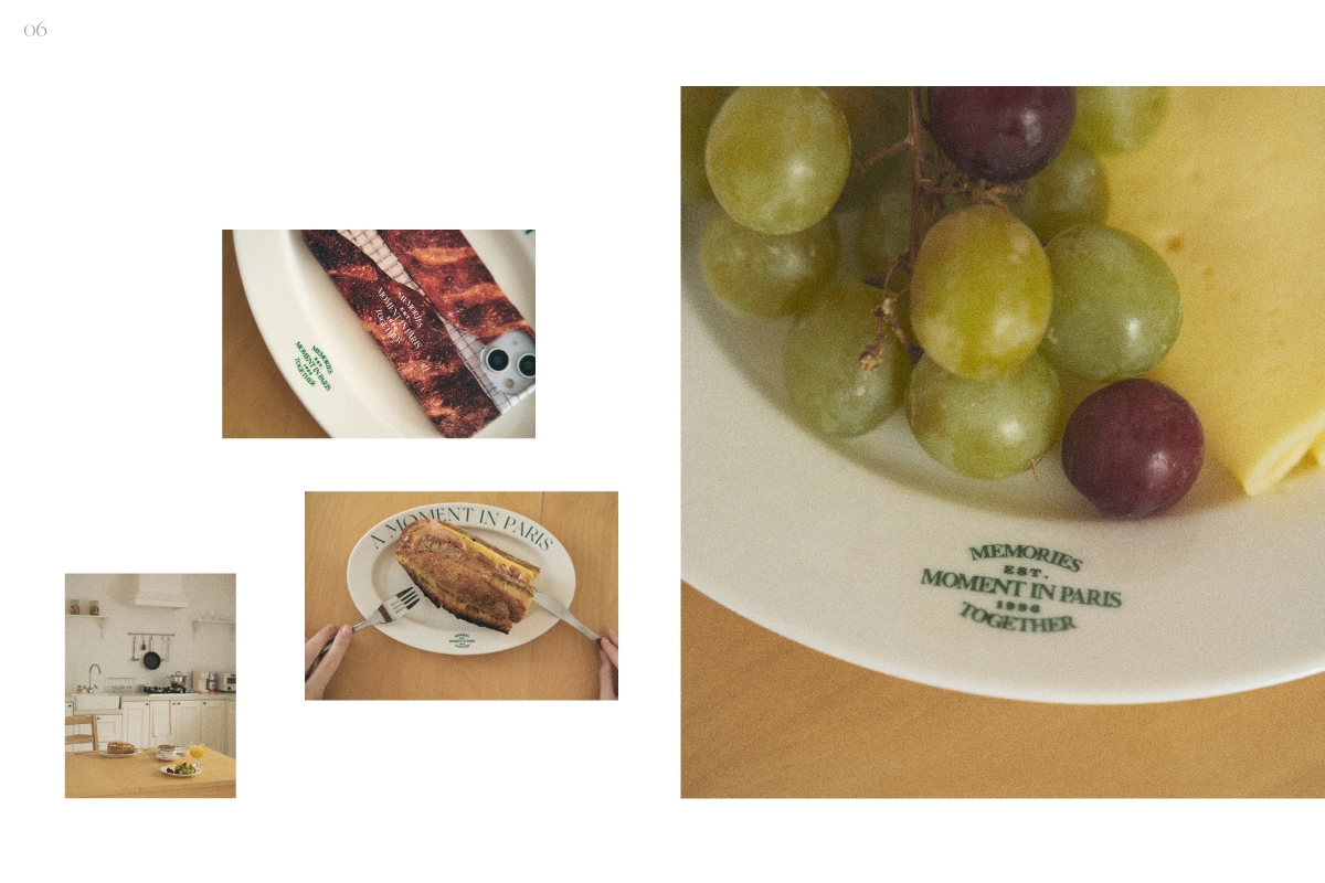메이드모먼의 첫 번째 컬렉션 ‘Paris in Moment’의 비주얼 작업을 진행하였습니다. 스웻셔츠, 볼캡, 플레이트, 핸드폰 케이스 등으로 구성된 컬렉션의 브랜드 정체성 확장을 목표로, 촬영 기획부터 스타일링, 현장 디렉팅, 이미지 편집, 룩북과 웹 콘텐츠 디자인까지 전반적인 작업을 담당하였습니다. 브랜드의 첫 컬렉션인 만큼 제품의 성격과 방향성을 면밀히 반영하여 기획하였으며, 일관된 비주얼 아이덴티티를 통해 브랜드 인지도를 효과적으로 강화하였습니다.