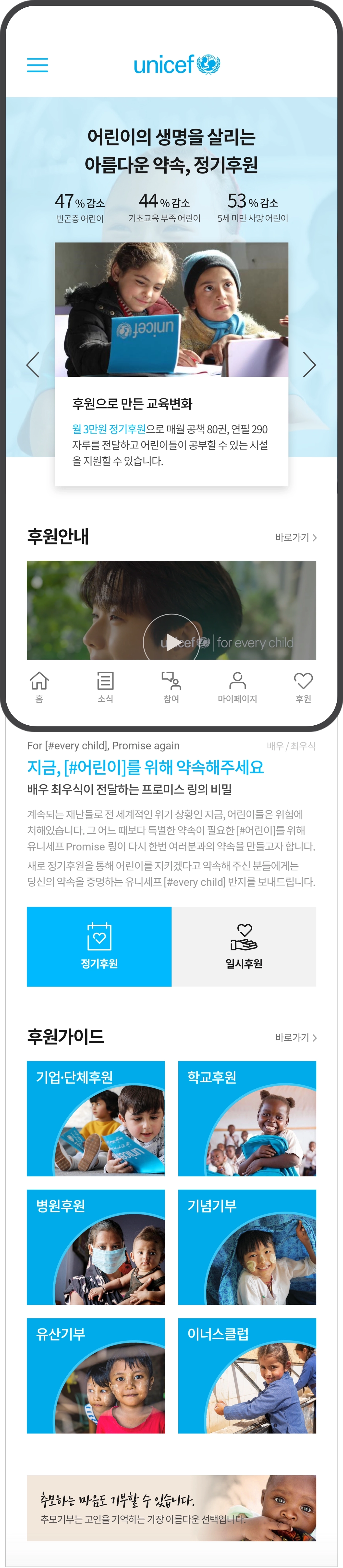 웹사이트 리뉴얼 개인 프로젝트입니다. 유니세프는 전 세계 아이들을 위한 국제 구호 단체로, 후원에 친근하게 접근할 수 있도록 밝고 간결한 톤앤매너로 구성하였습니다. 사이트 구조와 콘텐츠 흐름에 맞춰 PC · Mobile 페이지의 레이아웃을 기획하고, 배너, 버튼, 아이콘 등 UI 전반을 포함한 웹 UI/UX 및 그래픽 디자인을 진행하였습니다. 명확한 메시지 전달과 직관적인 인터페이스로 후원 유입을 유도하는 방향으로 완성한 프로젝트입니다.