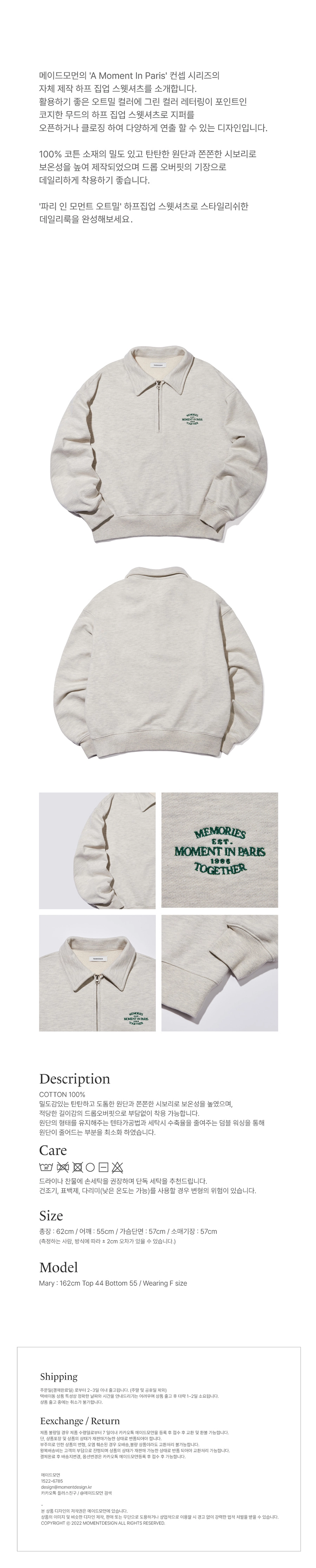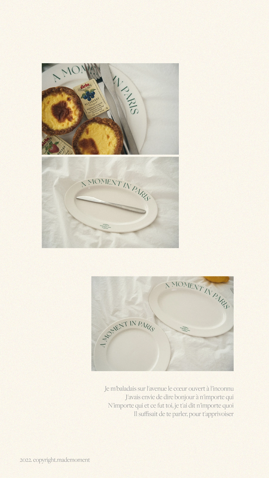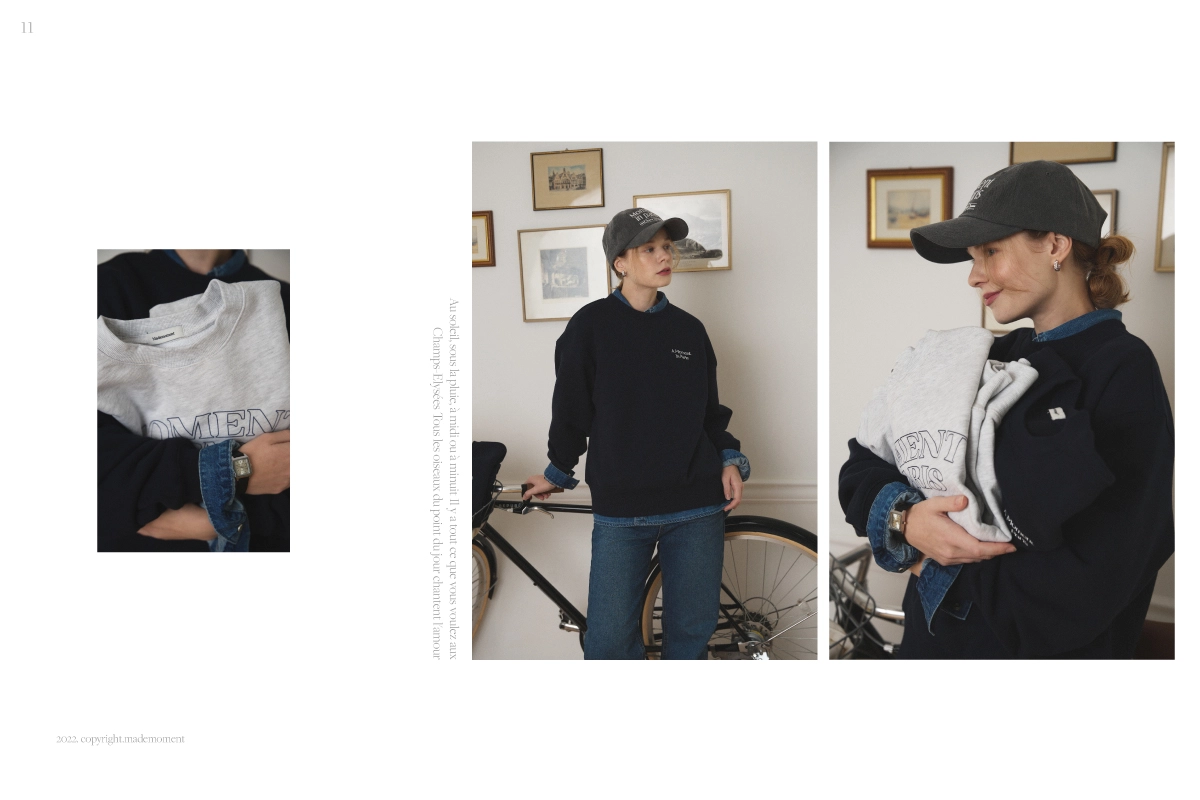 메이드모먼의 첫 번째 컬렉션 ‘Paris in Moment’의 비주얼 작업을 진행하였습니다. 스웻셔츠, 볼캡, 플레이트, 핸드폰 케이스 등으로 구성된 컬렉션의 브랜드 정체성 확장을 목표로, 촬영 기획부터 스타일링, 현장 디렉팅, 이미지 편집, 룩북과 웹 콘텐츠 디자인까지 전반적인 작업을 담당하였습니다. 브랜드의 첫 컬렉션인 만큼 제품의 성격과 방향성을 면밀히 반영하여 기획하였으며, 일관된 비주얼 아이덴티티를 통해 브랜드 인지도를 효과적으로 강화하였습니다.