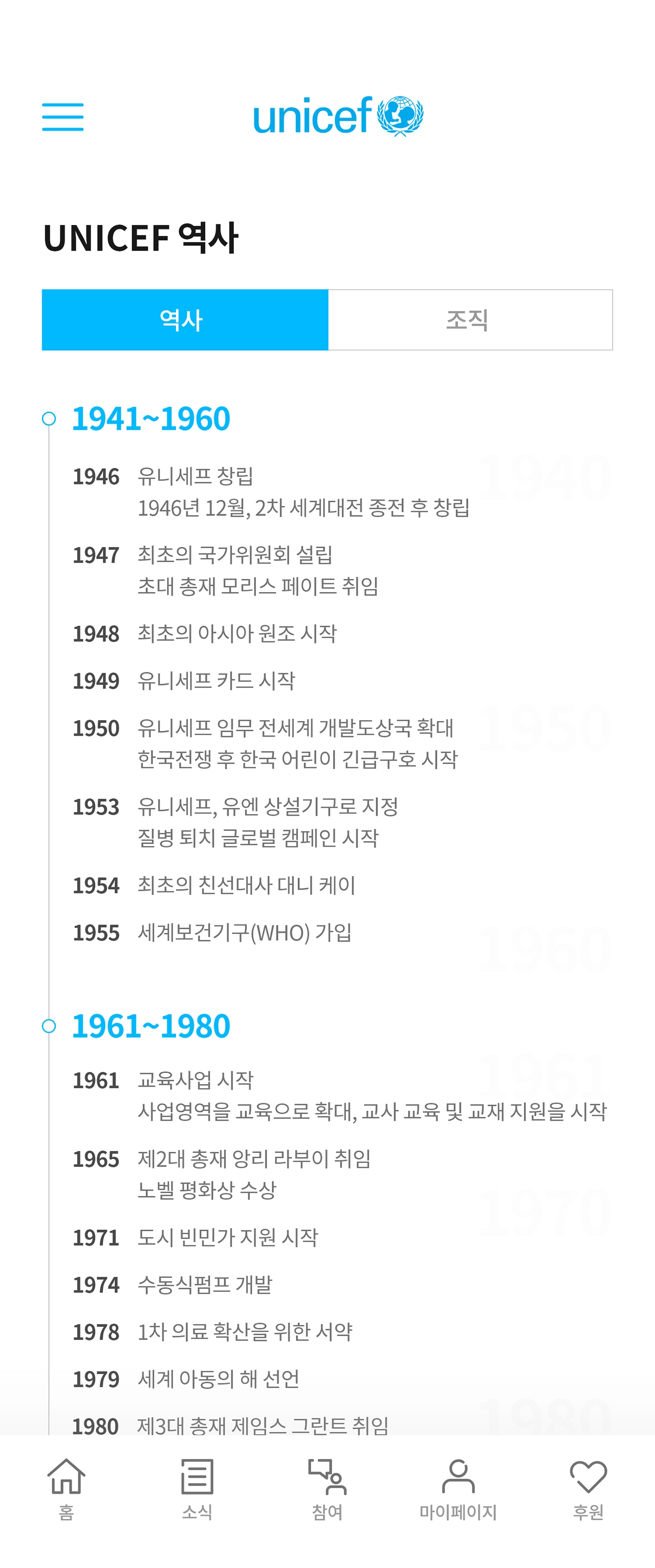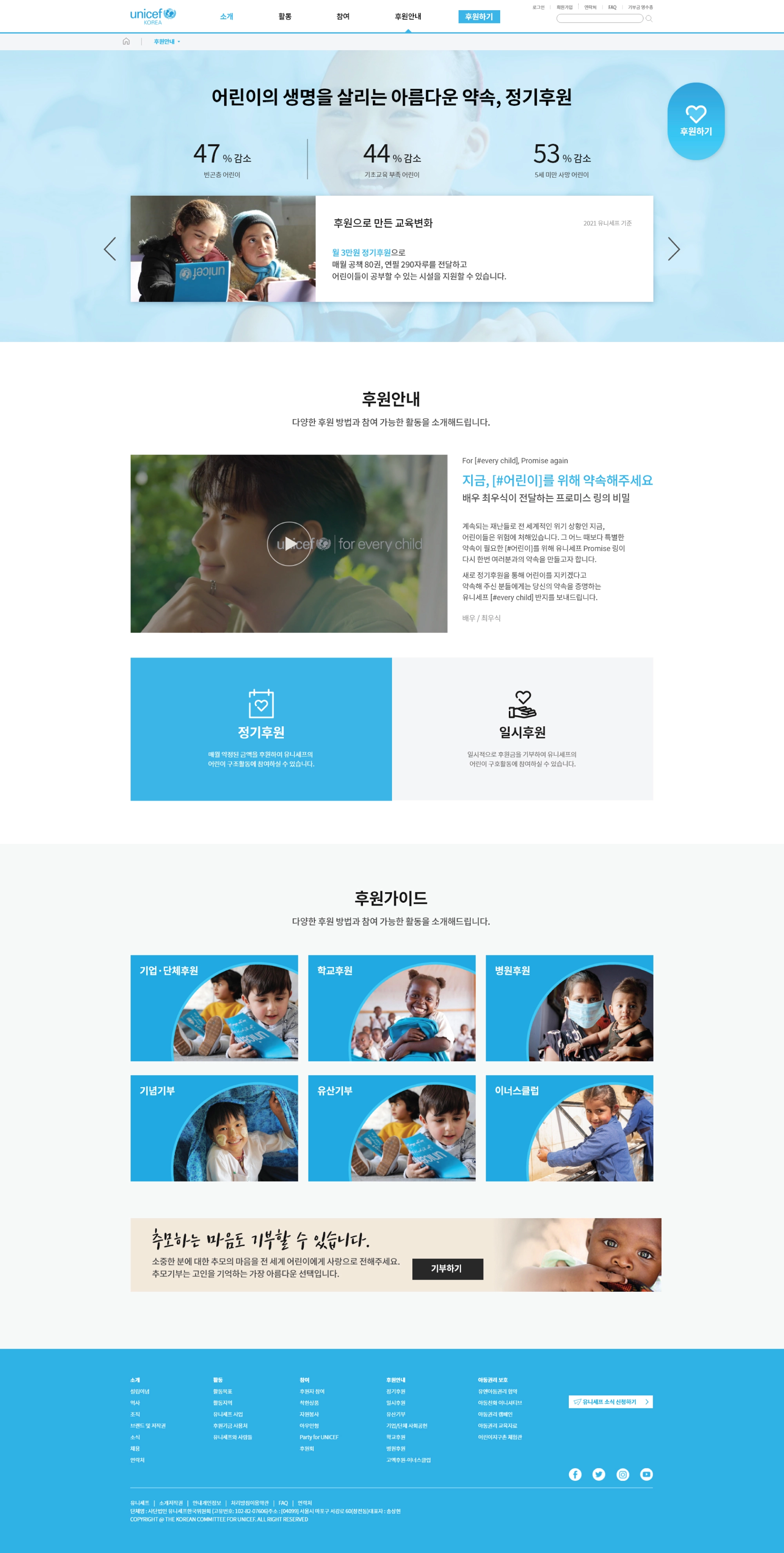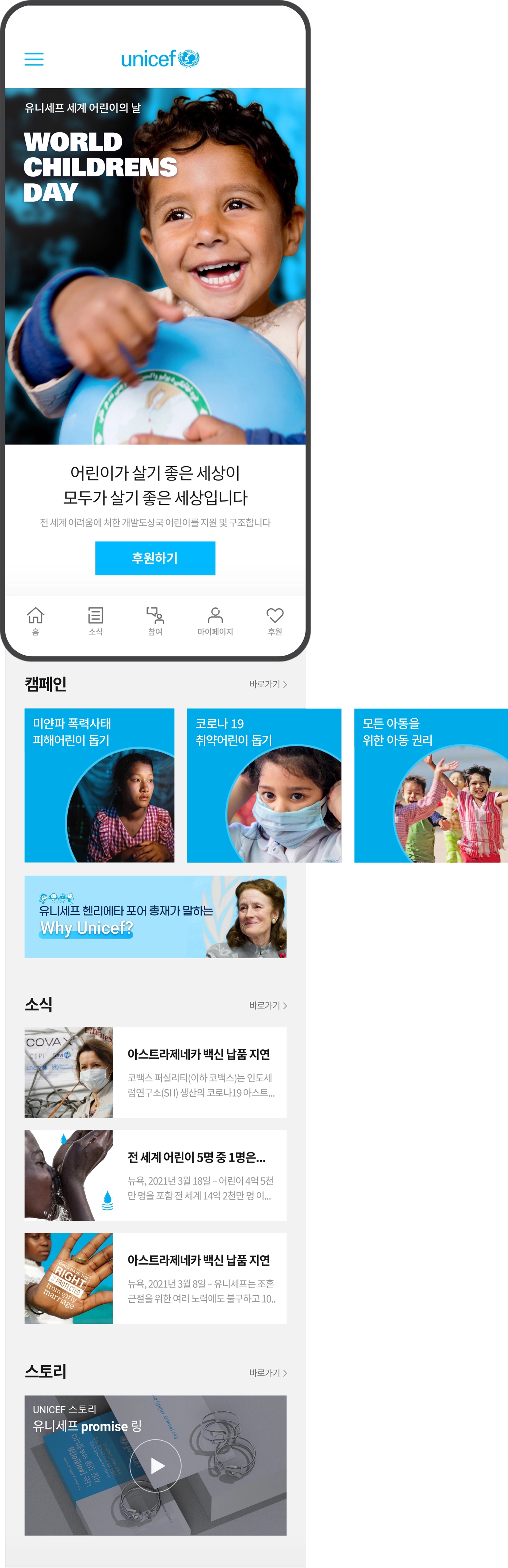 웹사이트 리뉴얼 개인 프로젝트입니다. 유니세프는 전 세계 아이들을 위한 국제 구호 단체로, 후원에 친근하게 접근할 수 있도록 밝고 간결한 톤앤매너로 구성하였습니다. 사이트 구조와 콘텐츠 흐름에 맞춰 PC · Mobile 페이지의 레이아웃을 기획하고, 배너, 버튼, 아이콘 등 UI 전반을 포함한 웹 UI/UX 및 그래픽 디자인을 진행하였습니다. 명확한 메시지 전달과 직관적인 인터페이스로 후원 유입을 유도하는 방향으로 완성한 프로젝트입니다.